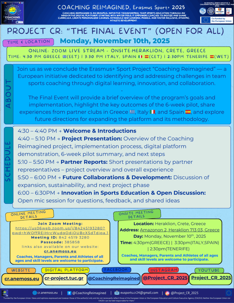 The final event of the Coaching Reimagined project took place on November 10th, 2025 in Heraklion, Crete, bringing together our amazing partners from Tenerife (Spain – Club Natación Echeyde), Pescara (Italy – Universo SSD), Chania (Greece – Anemos Nautical and Cultural Club Chania, Technical University of Crete (TUC)) and Heraklion(Greece, OFI Water Polo Club) .